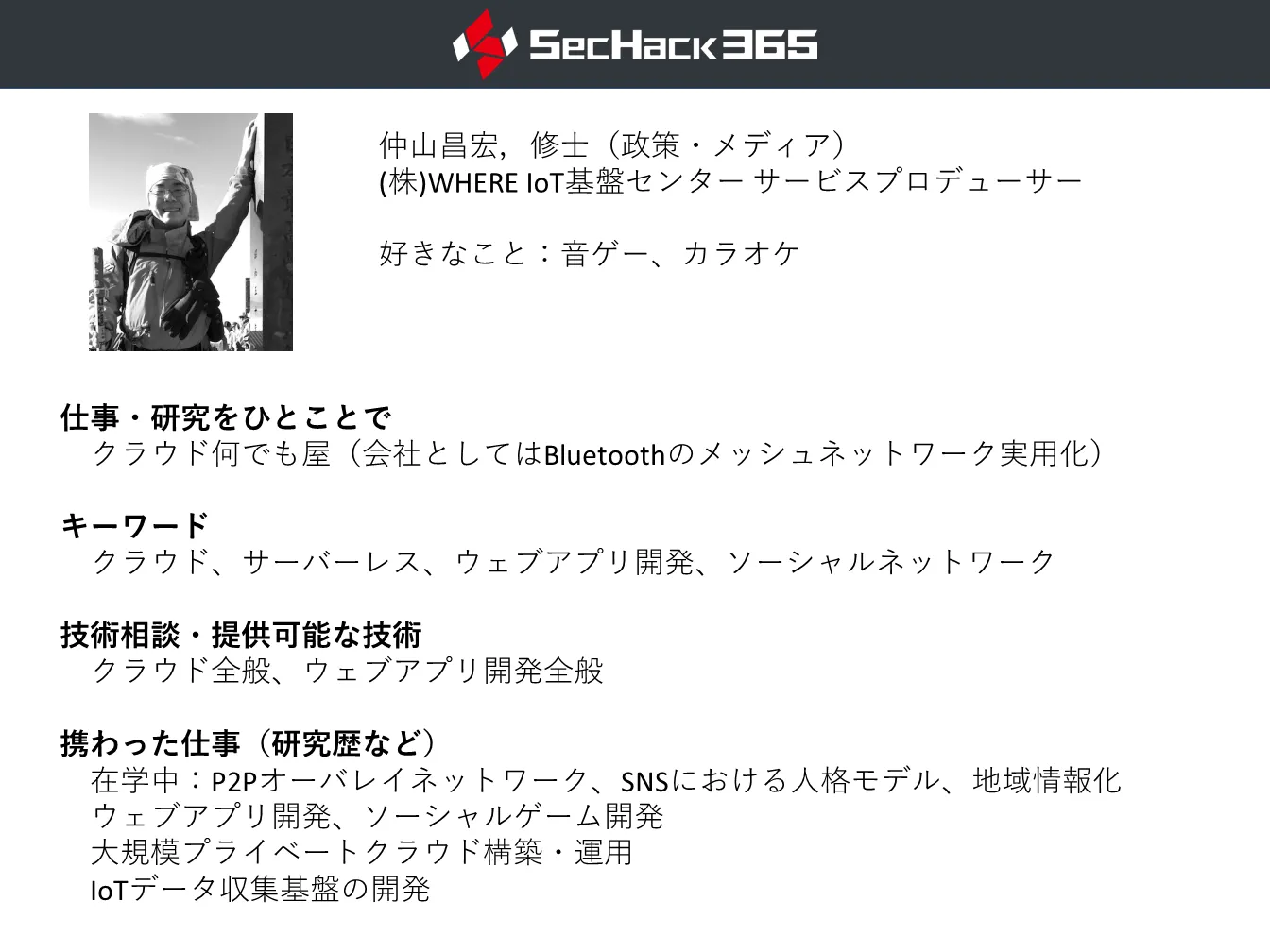 坂井さんです。そしてコースマスターをサポートするトレーナーがいます。衛藤さん、笠間さん、安田さん、花田さん、加藤さん、井上さん、神薗さん、今さん、仲山さん、くぼたつさん、そして服部さん。またアドバイザーとして、今岡さん。このほかナショトレのセンター長である園田さん。SecHack365実行委員長の小泉さん。あと忘れてはならないのが、SecHack365事業統括の横山さん。