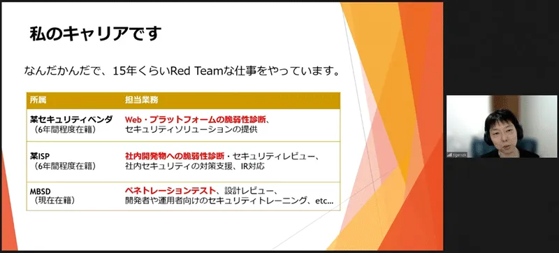 洲崎さんの現在のお仕事は、ペネトレーションテスト(システムの脆弱性を探すセキュリティテスト)のサービスで、いわゆる「RedTeam」と言われるセキュリティエンジニアのお仕事とのこと。洲崎さんは15年ほどこの仕事をされていて、ご自身にとって天職だと思えるほど楽しんで仕事をされているそうで、きらきら目を輝かせながらお話をしてくださいました。洲崎さんが携わられている仕事の魅力や従事者としての視点、ペネトレーションテストから見えるセキュリティの難しさ等サイバーセキュリティの仕事についてわかりやすく、具体的で生々しいお話をしてくださいました。