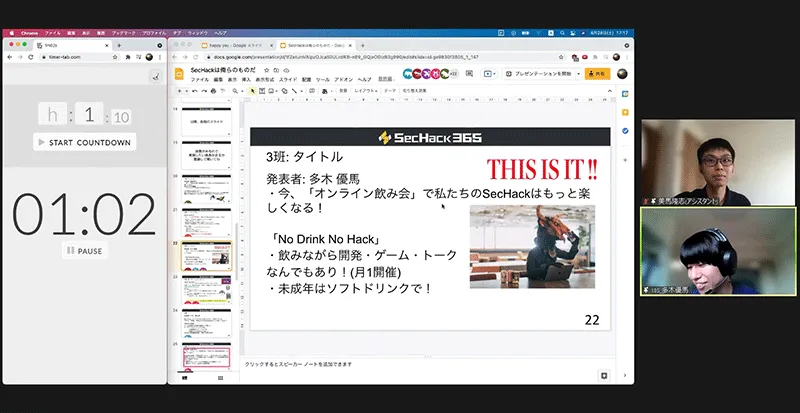 SecHack365がスタートしてから3か月経った今回、トレーニーたちの作品作りにおける現状の共有と相談の機会として実施しました。