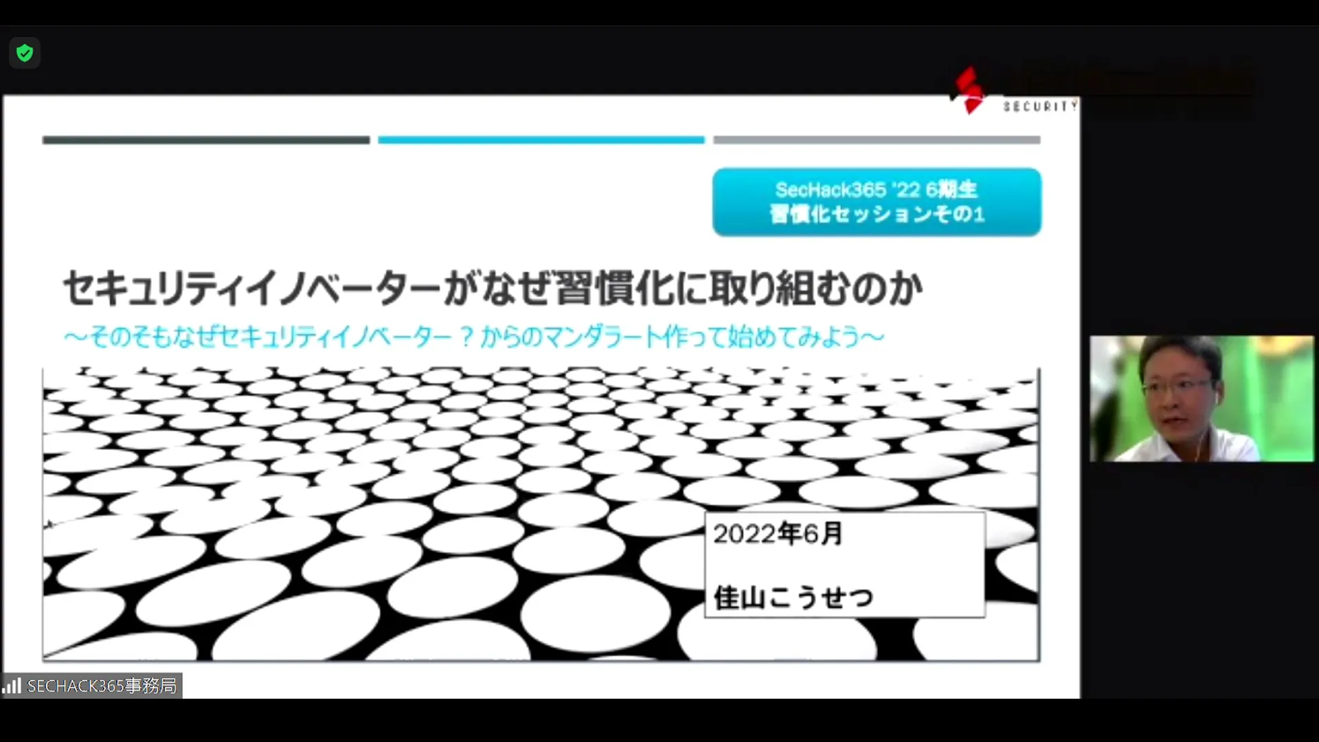 法律についての講義では僕の質問にとても親切に答えていただき、より深い知見を得ることが出来ました。また、習慣化についての講義ではマンダラートを作成する演習を通して、SecHack365期間中に達成したい目標について深堀りすることができました。