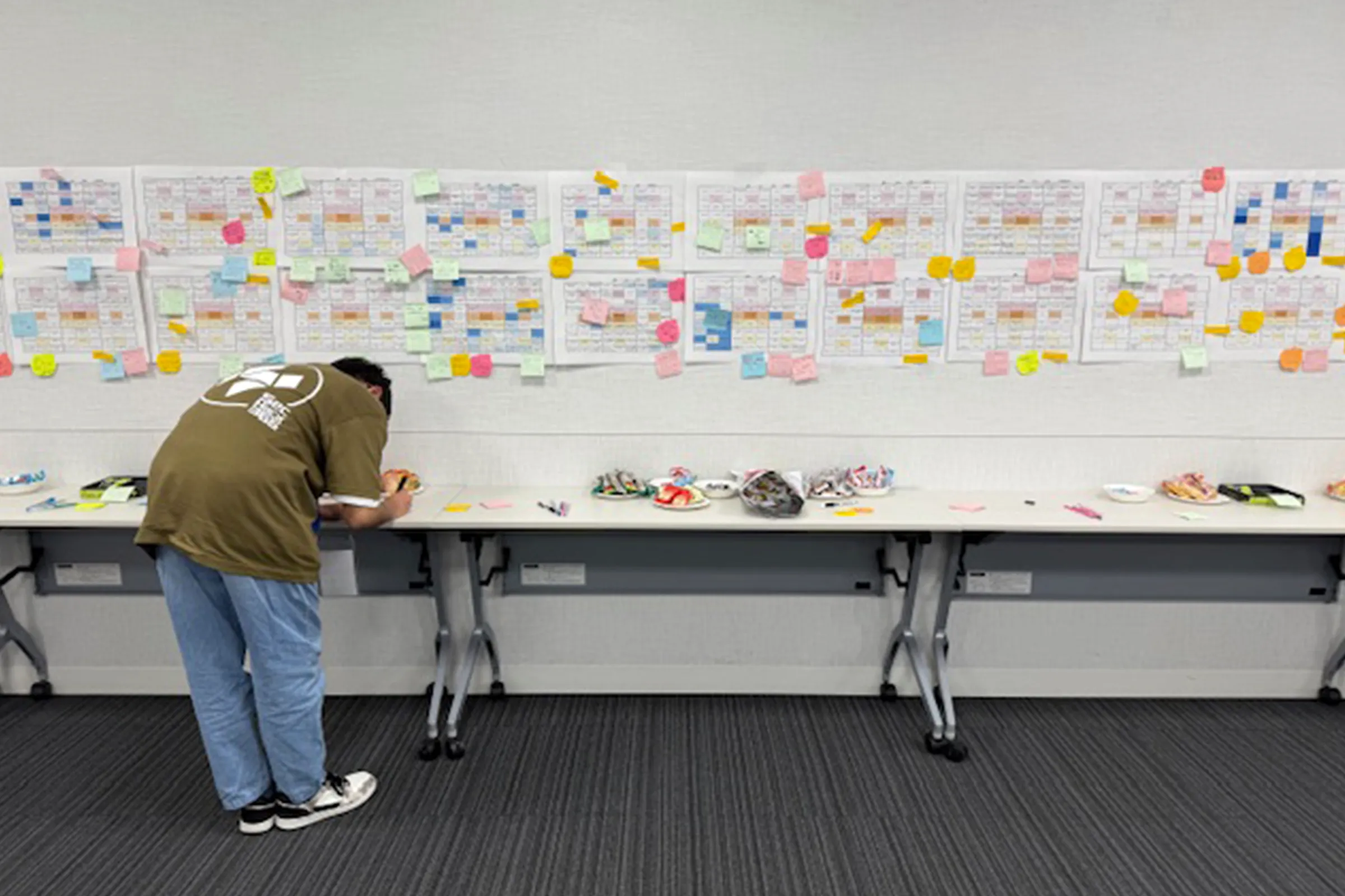 また、今や誰にとっても身近になった「SNS」を安心して使える仕組み作りに取り組もうとするトレーニーも複数いました。LLMで投稿内容を精査し、「身バレ」や「炎上」を防ぐというアイデアが複数展示され、「例年、似通ったアイデアが出ることはよくあることだから、ぜひお互いに情報交換し、差分は何かを調べてみるといいのでは」とフィードバックを受けていました。